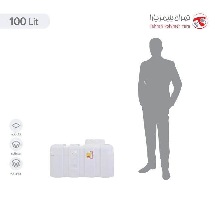منبع آب مکعبی که جهت ذخیره سازی آب شرب مورد استفاده قرار می گیرد، به حالت افقی بوده و رنگ ان سفید می باشد. این مخزن آب دارای درب مشکی رنگ می باشد که جهت ورود و خروج مایعات تعبیه شده است. ارتفاع 43 سانتیمتر، عرض 45 سانتیمتر و طول 77 سانتی متر ابعاد این مخزن آب 100 لیتری را تشکیل می دهند.