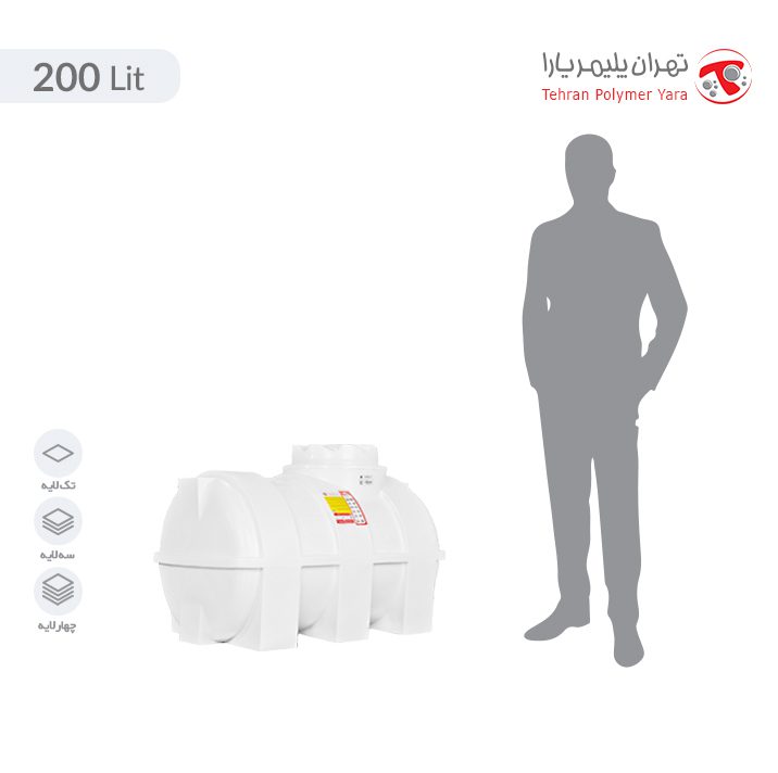 منبع آب 200 لیتری افقی پلی اتیلنی برای ذخیره طولانی مدت ذخیره آب ساخته شده است. این مخازن از پلی اتیلن تأیید شده غذایی FDA / NSF ساخته شده و به دلیل سه لایه بودن، دارای مهارکننده های UV داخلی است. لایه مشکی رنگ به کار رفته داخل مخزن آب ۲۰۰ لیتری مانع عبور نور به داخل مخزن شده و نقش فیلتر نوری را ایفا نموده و همچنین باعث استحکام ساختاری مخزن می گردد.