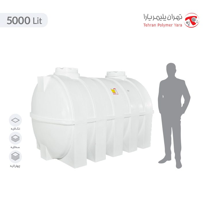مخزن 5000 لیتری افقی، یک مخزن نگهداری آب سفید رنگ با درب مشکی از جنس پلی اتیلن به ابعاد: طول 266، عرض 167 و ارتفاع 172 سانتیمتر می باشد. علاوه بر سه لایه بودن و دارا بودن خصوصیت آنتی باکتریال و ضد جلبک بودن، دارای ویژگی های منحصربفرد دیگری هم می باشد. از جمله: داشتن وزن سبک و استحکام بالا، نصب و راه اندازی آسان، مقاومت در برابر خوردگی، بدون درز بودن و امکان حمل و نقل آسان